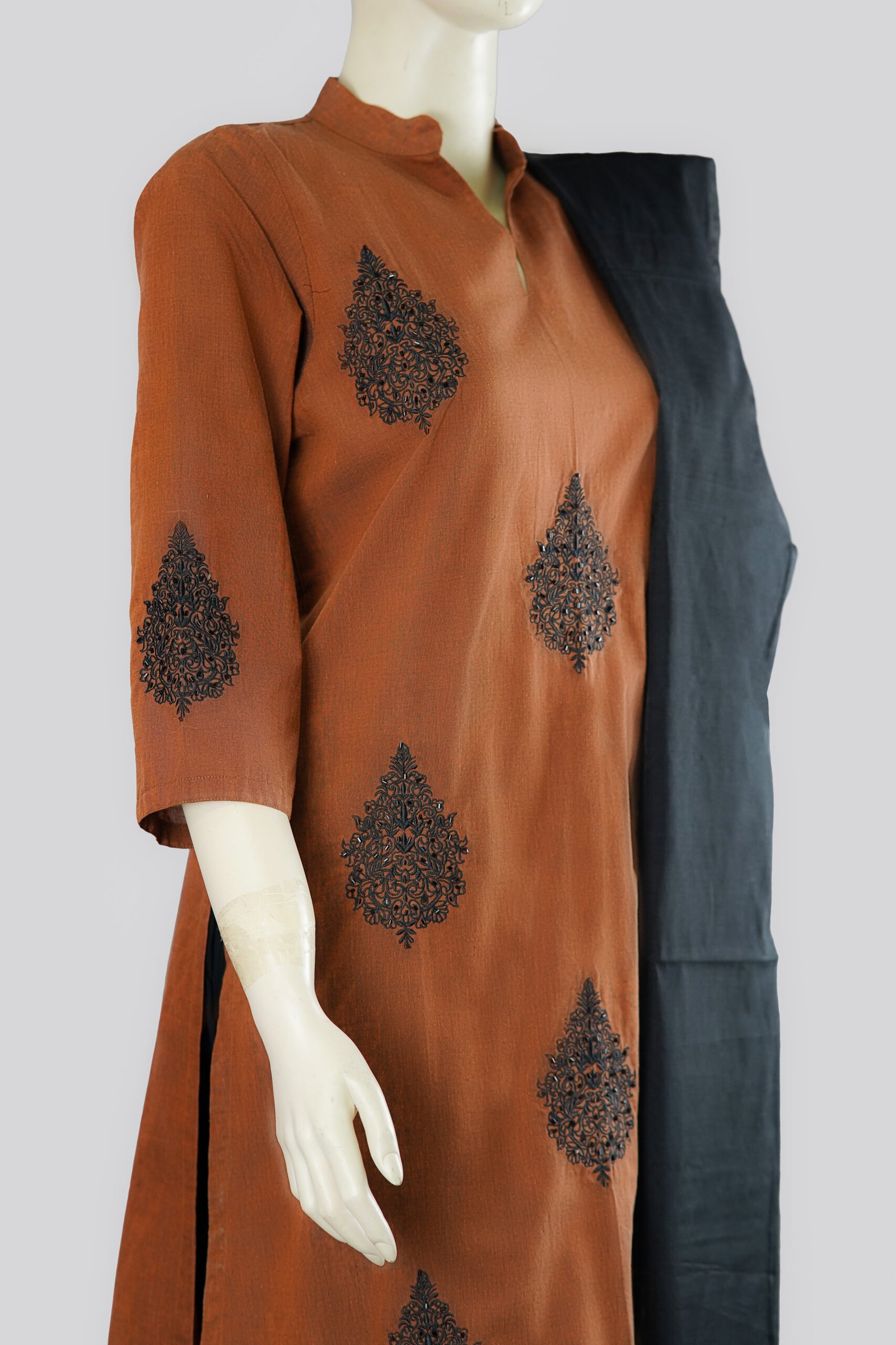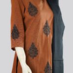 Embody understated sophistication with the Amber Noir Three-Piece Set, a perfect harmony of rich tones and refined craftsmanship. The warm amber kamiz is beautifully adorned with fine embroidery and handwork, forming timeless motifs that highlight its artisanal appeal.