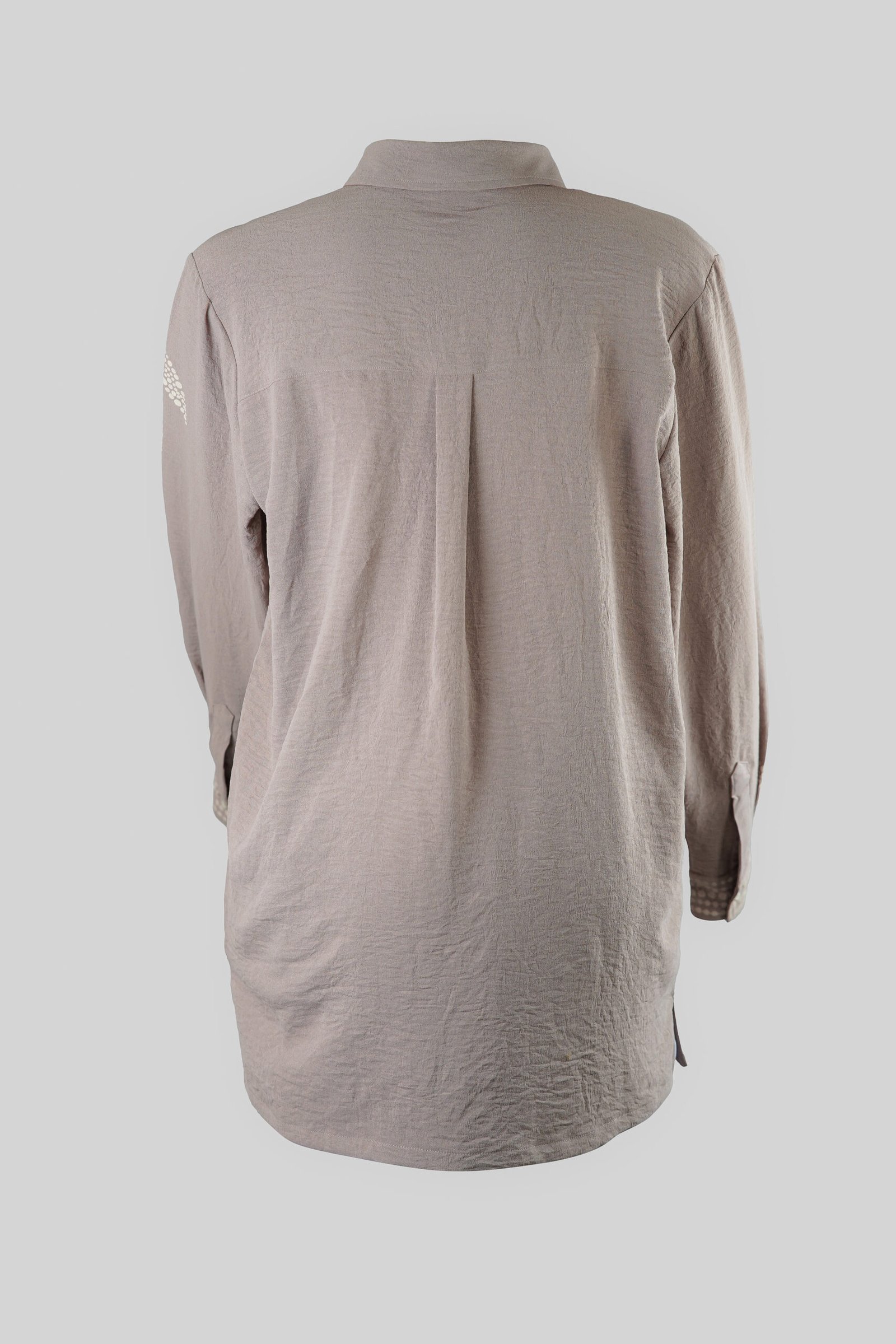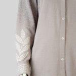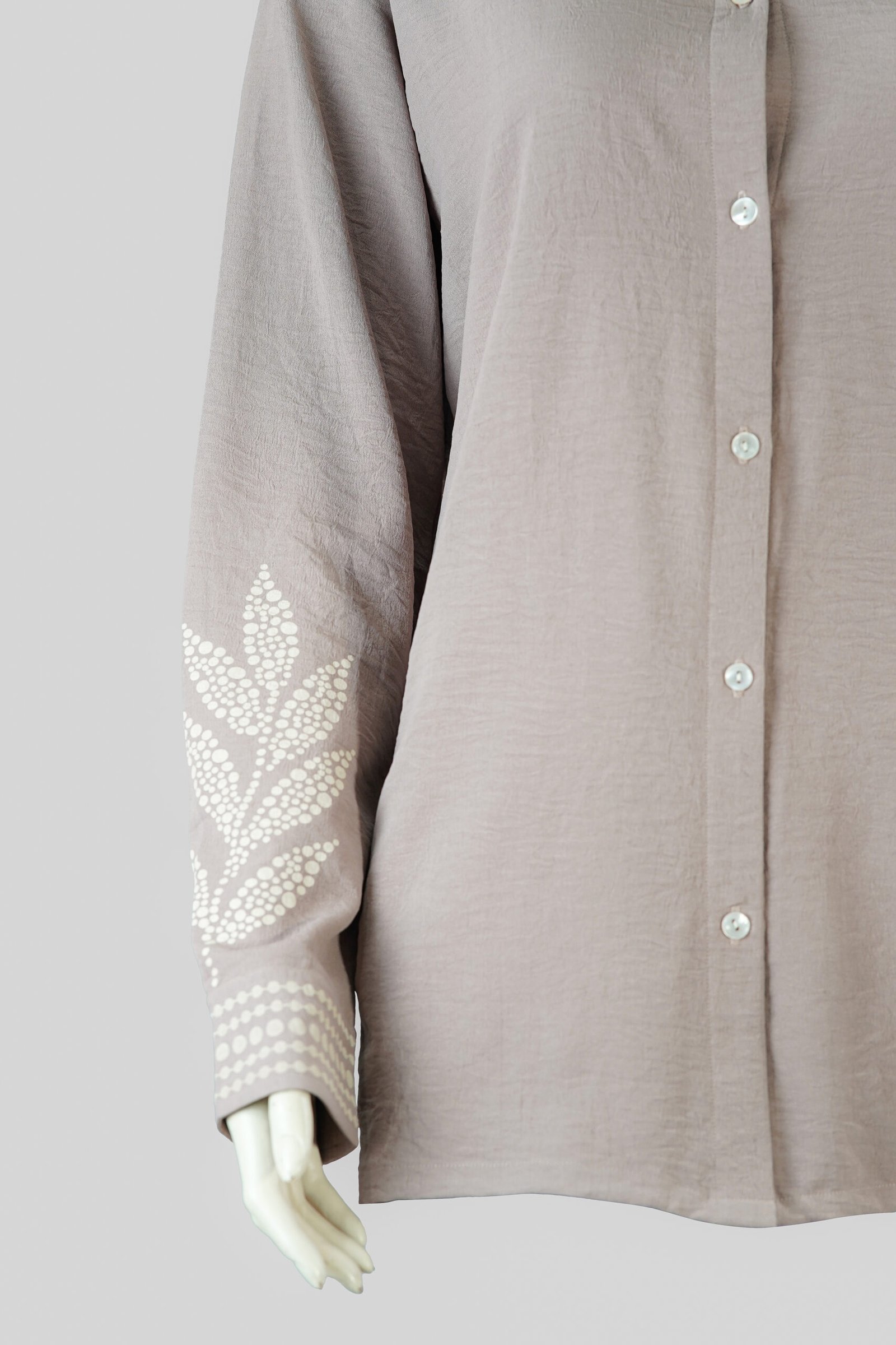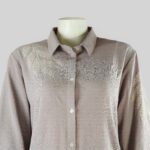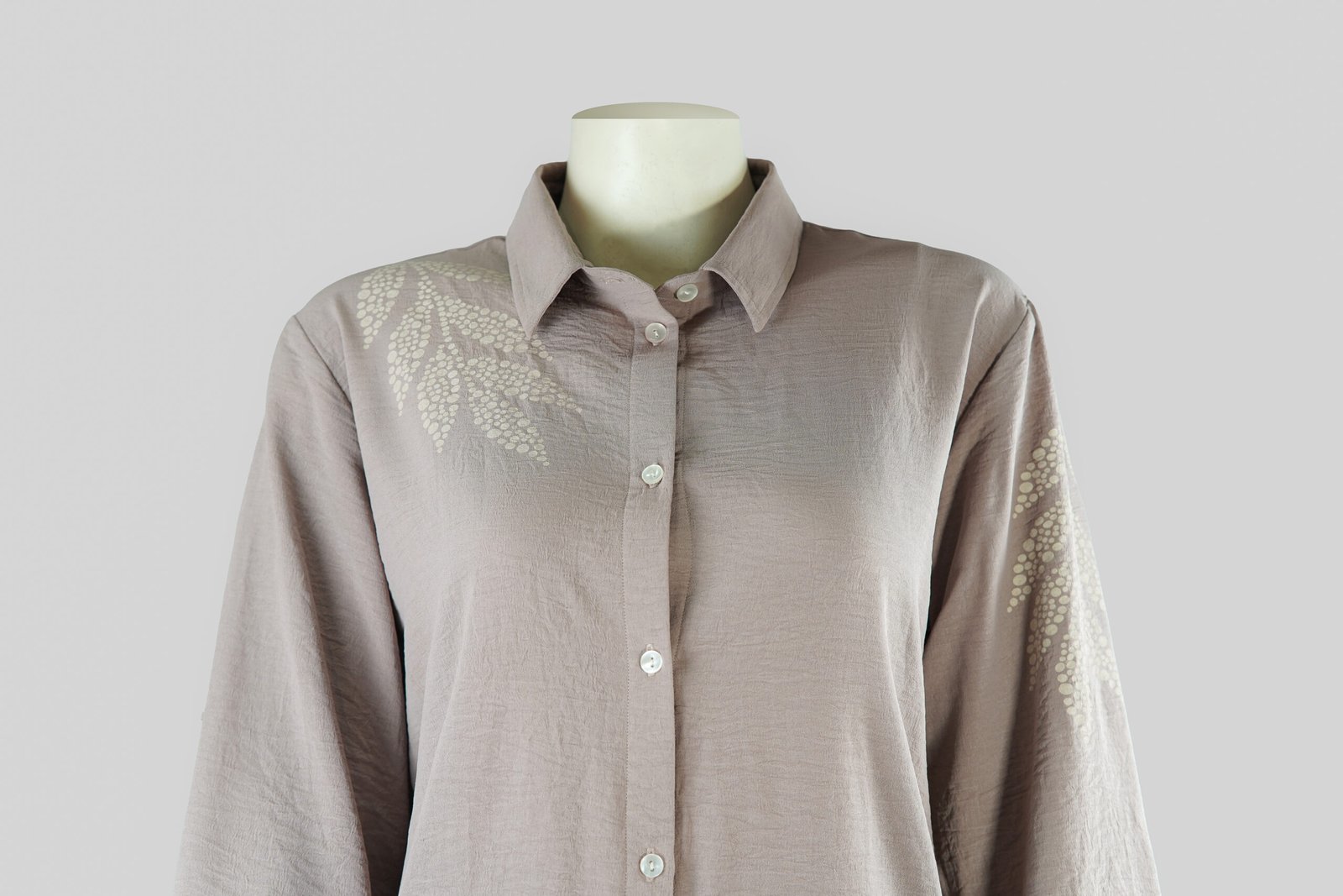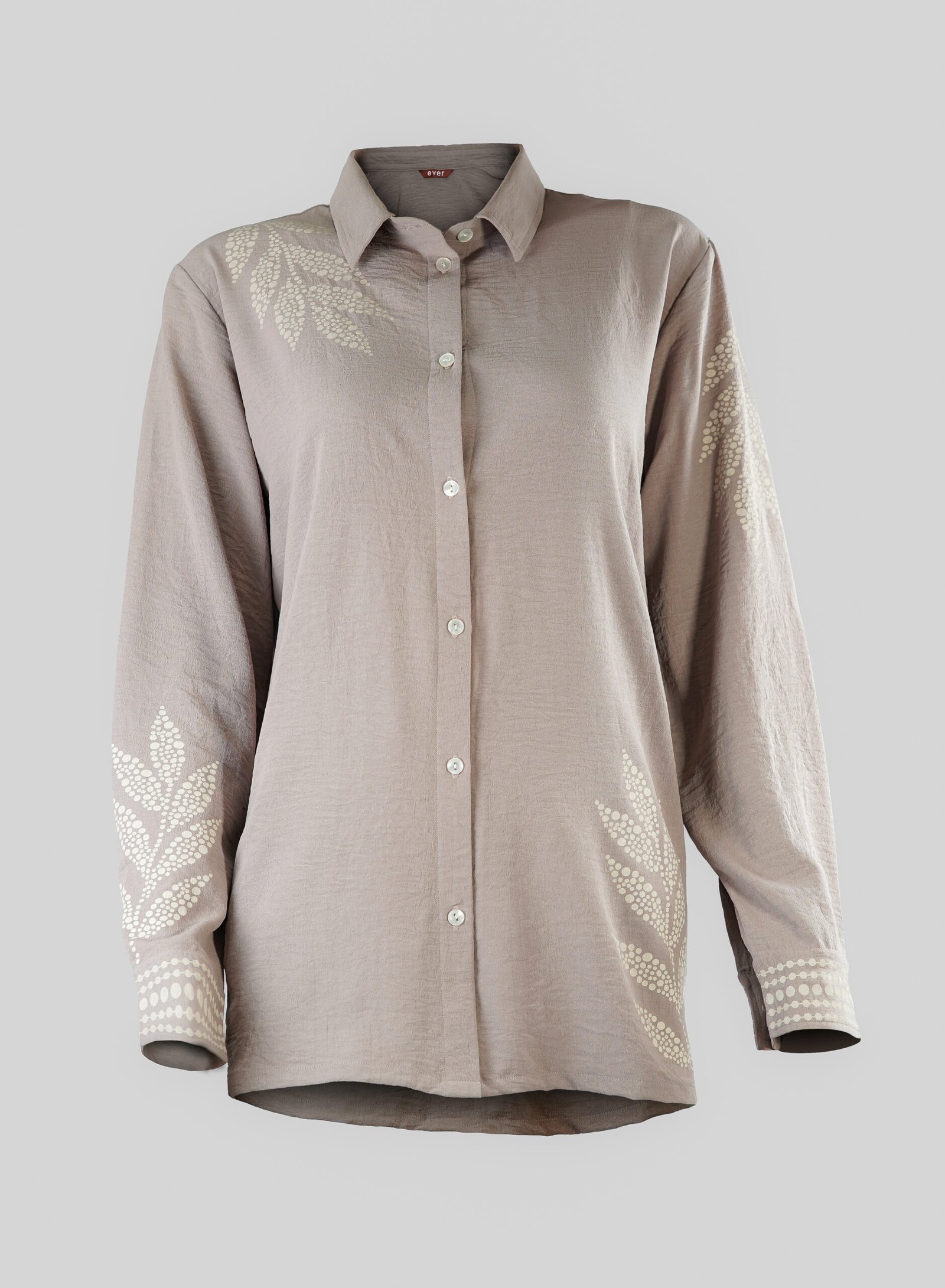 The soft ash beige tone is beautifully detailed with delicate leaf-inspired screen prints, adding a touch of understated elegance. Featuring a classic collared neckline, button-down front, and long sleeves, this shirt is a timeless addition to your wardrobe — perfect for both office wear and casual occasions.