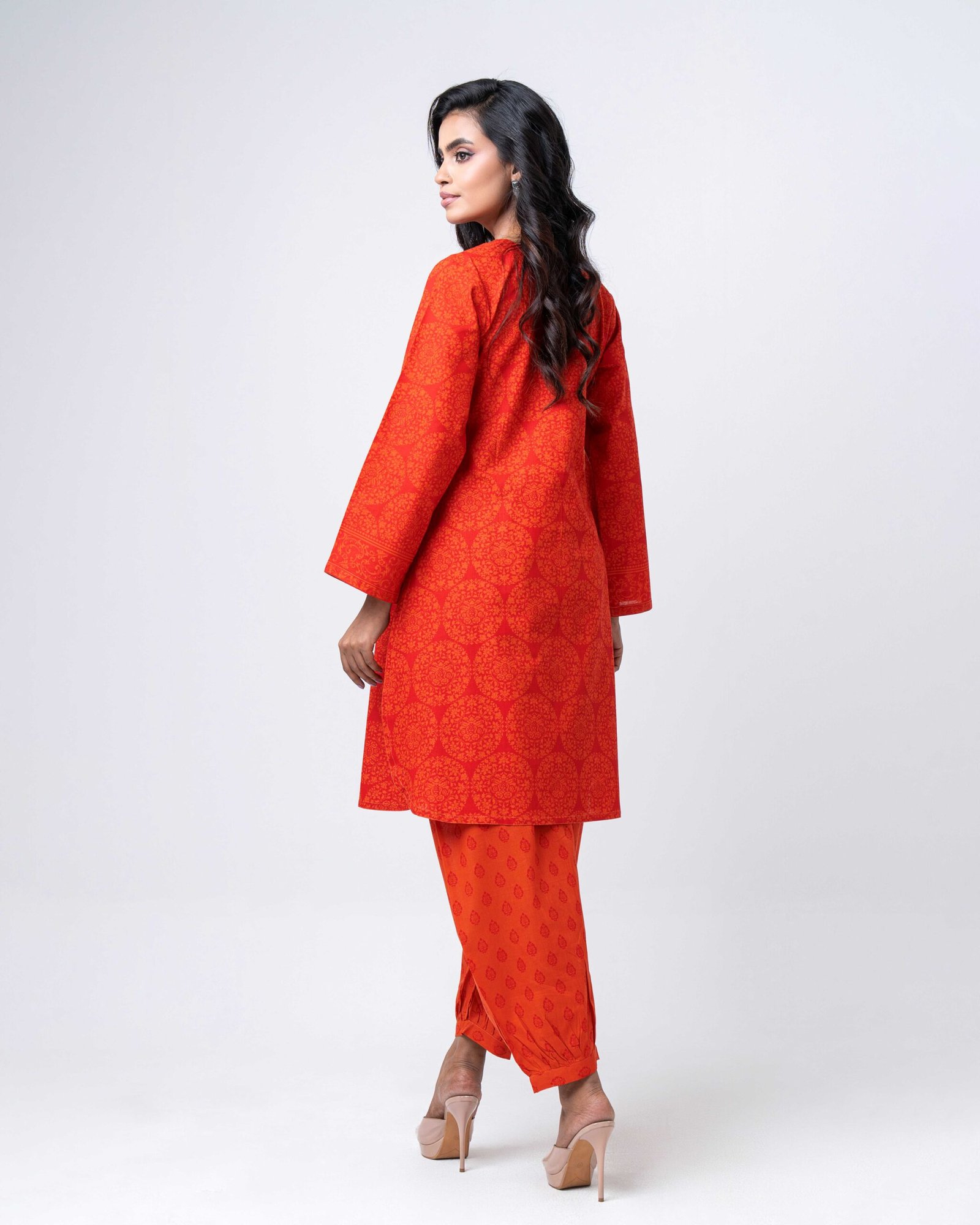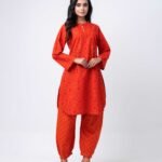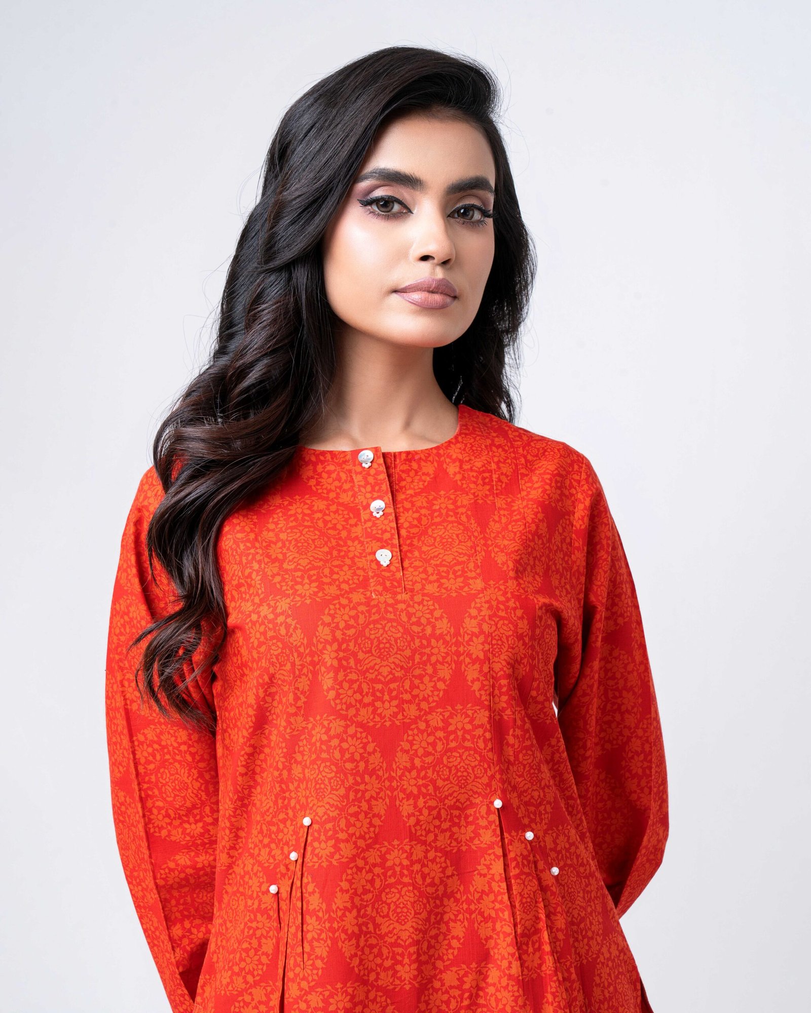 This elegant two-piece outfit features a beautifully printed kurta paired with matching pants. Crafted from soft, breathable fabric, it ensures all-day comfort with a relaxed and flattering fit. The rich red tone and subtle all-over print add a refined charm.