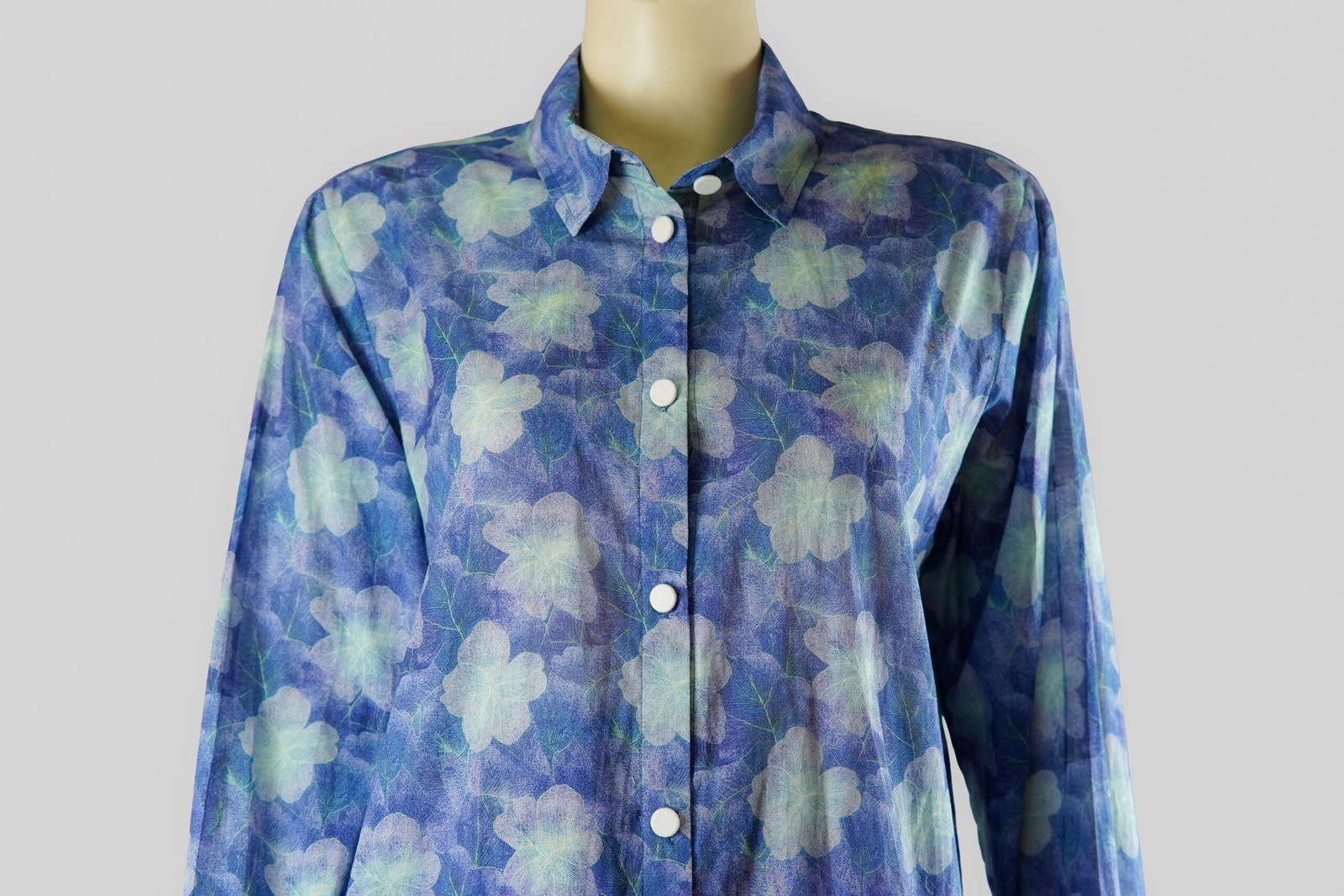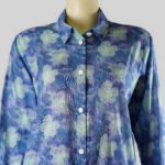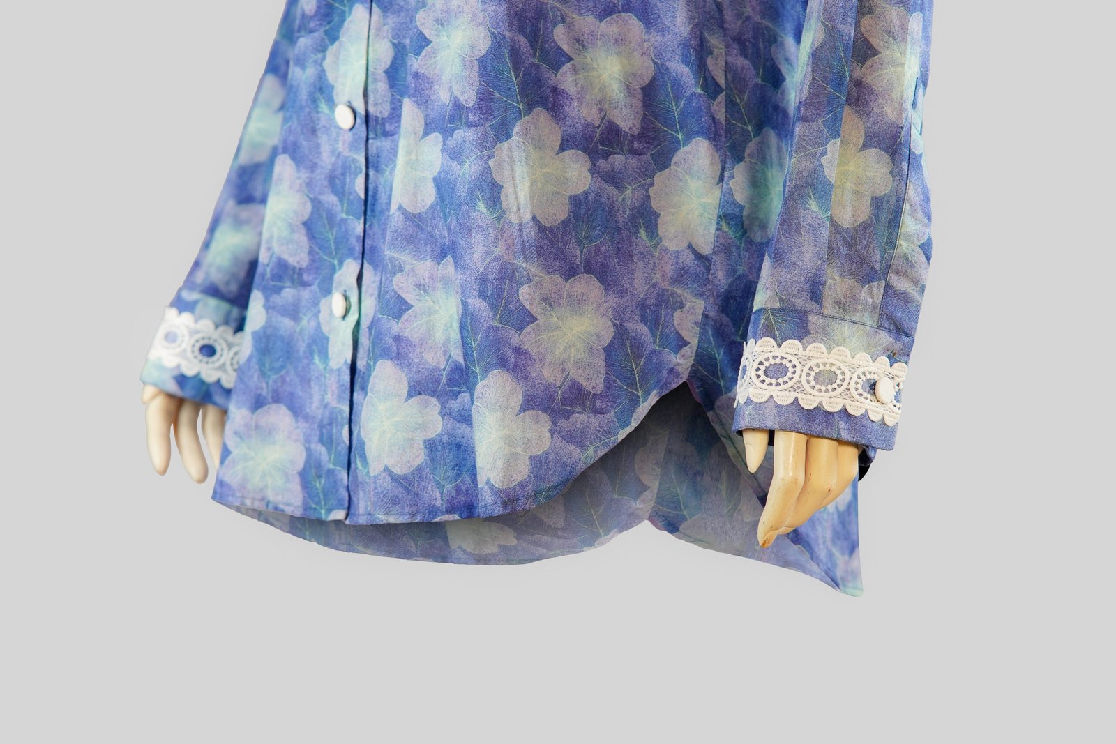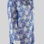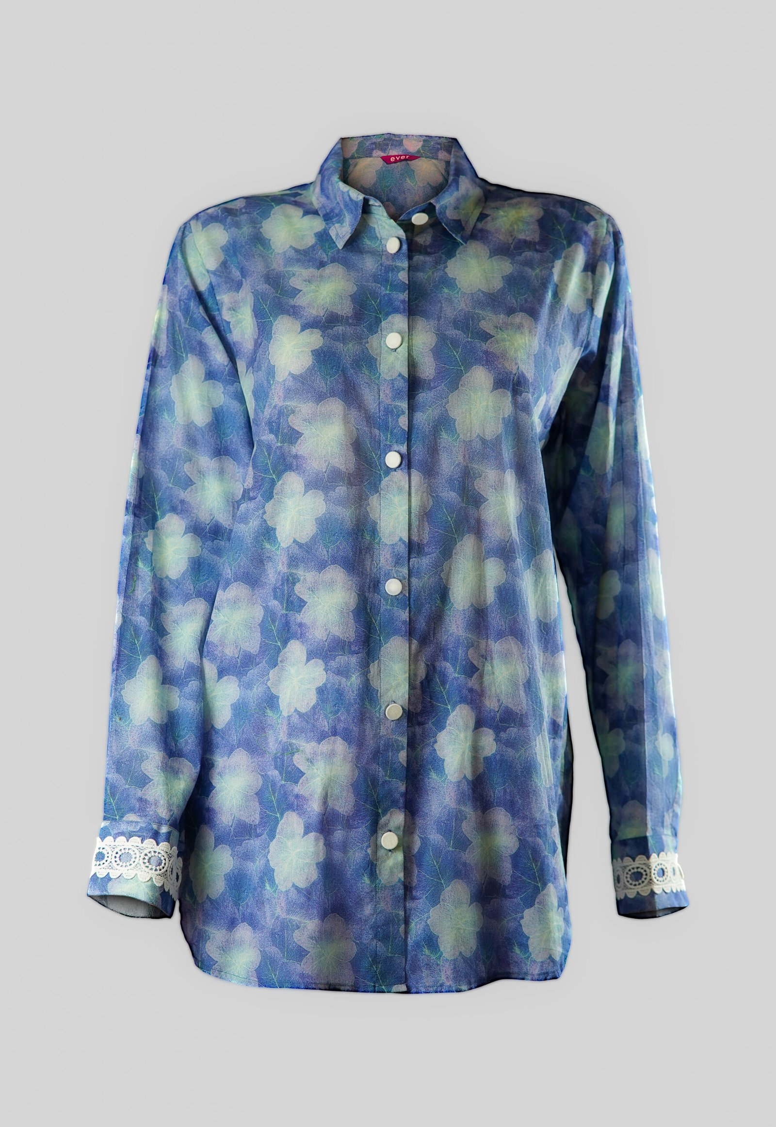 The dreamy blue base is adorned with delicate floral patterns, creating a refined, feminine charm that’s perfect for everyday wear. Designed with a collared neckline, button-down front, and lace-detailed cuffs, this shirt transitions beautifully from workdays to weekend outings.