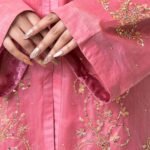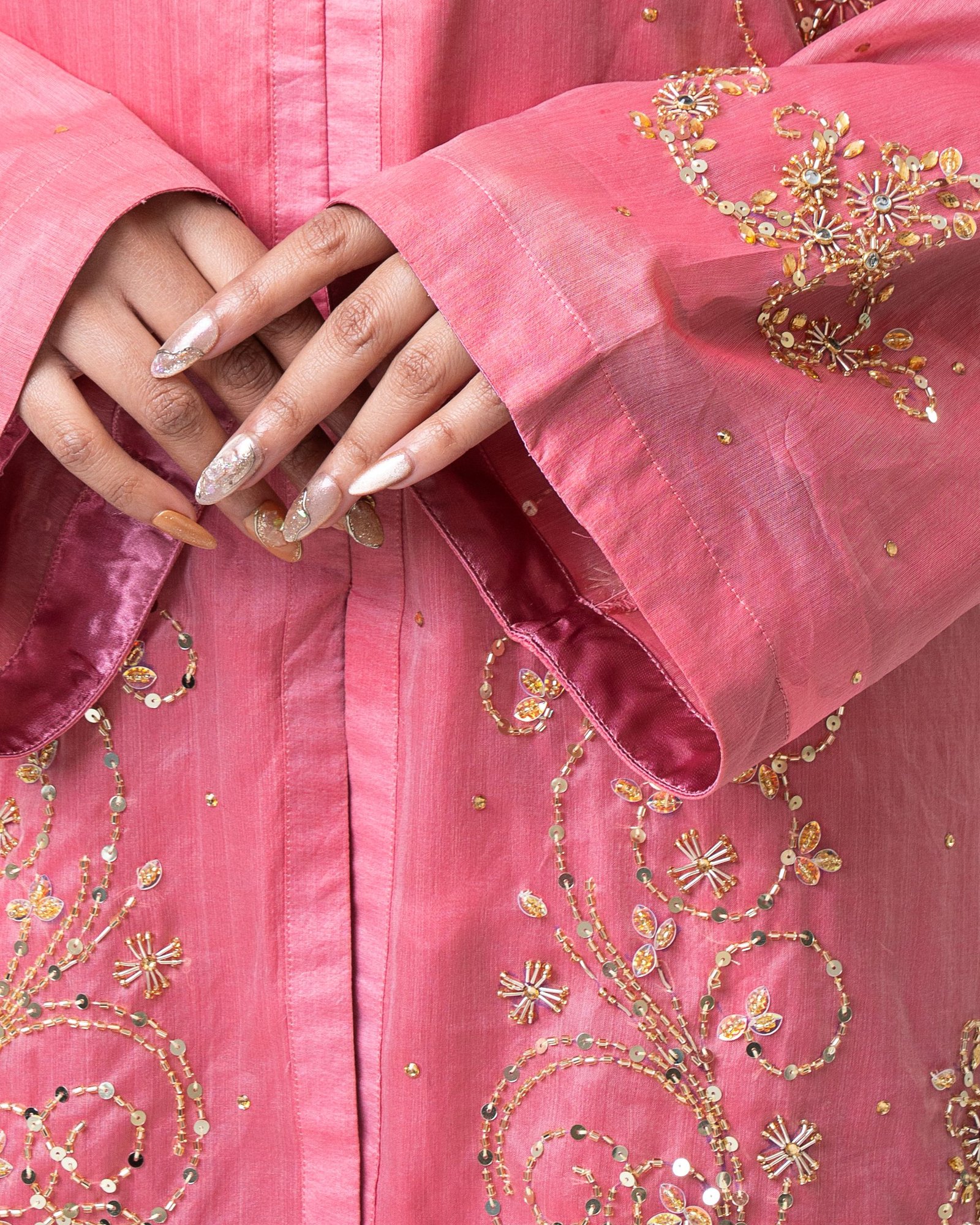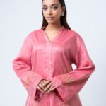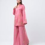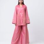 This elegant 2-piece koti set is crafted from premium synthetic moslin, offering a soft texture with a graceful fall. The koti features delicate jori handwork and intricate floral detailing, adding a refined, luxurious touch. Paired with a flowy, wide-leg pant and finished with a smooth, luxury satin silk inner, this ensemble ensures both comfort and style.