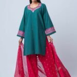 A graceful three-piece ensemble crafted from premium Shamry Jacquard Cotton, designed to bring together elegance and comfort. The kamiz features delicate embroidery enhanced with crystal handwork, beautifully highlighting the neckline and sleeves while subtle scattered embellishments add a refined sparkle across the fabric.