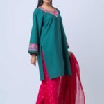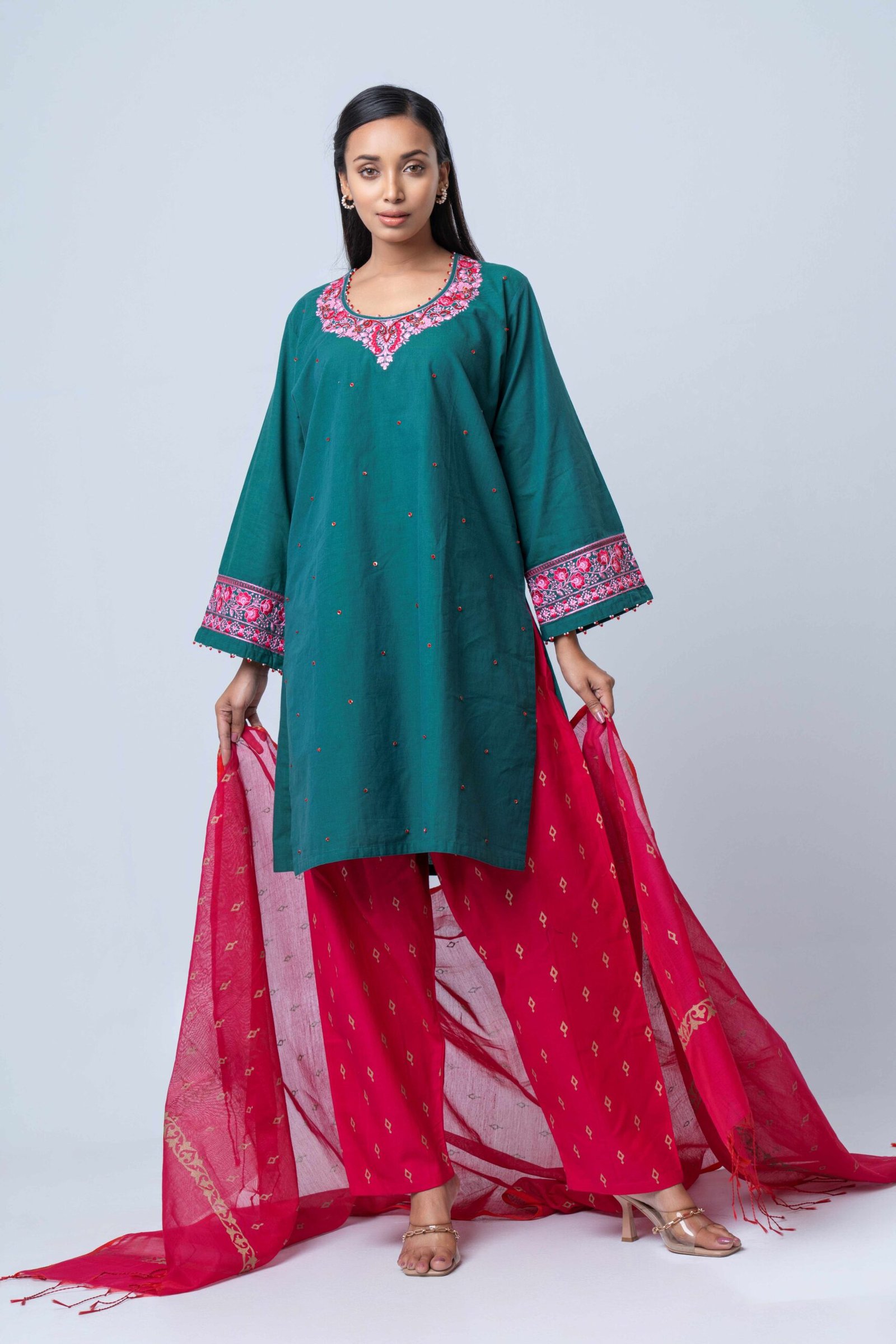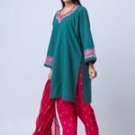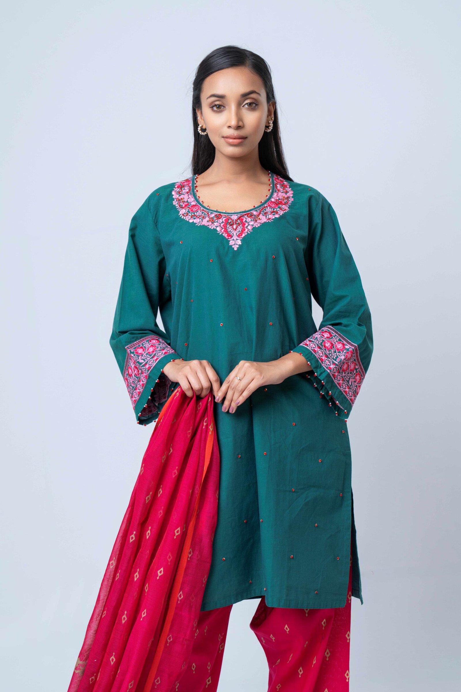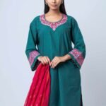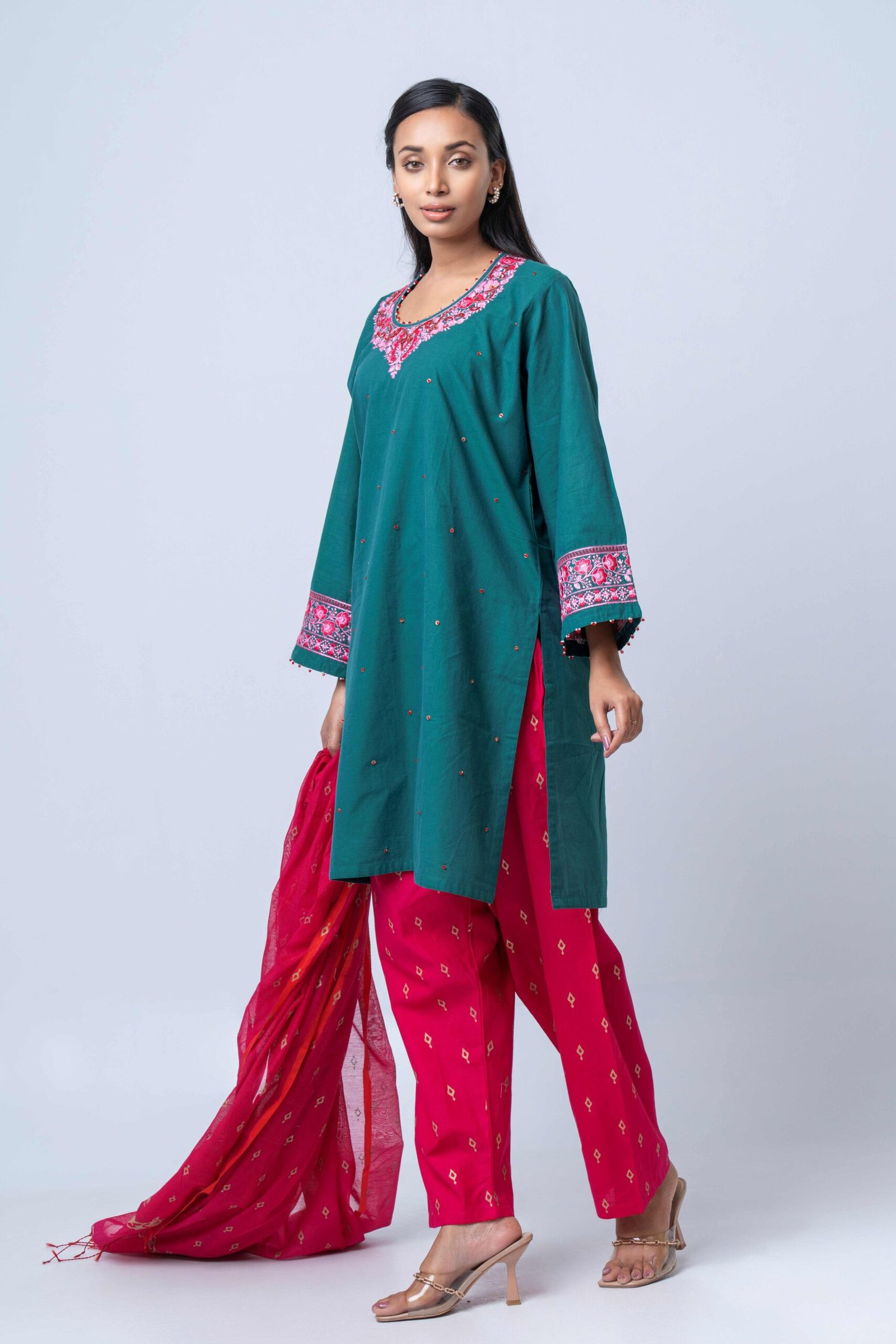 Paired with printed cotton design pants and a lightweight printed semi-moslin orna, the vibrant contrast of deep emerald and rich rosé tones creates a sophisticated yet festive look. This ensemble is perfect for festive gatherings, celebrations, and elegant daywear, offering a timeless blend of craftsmanship and modern style.