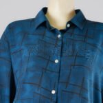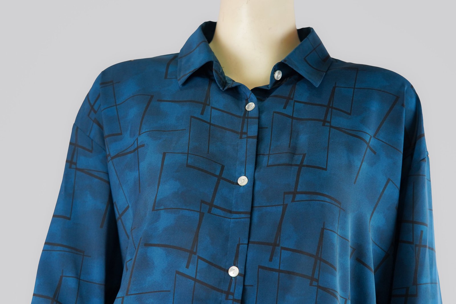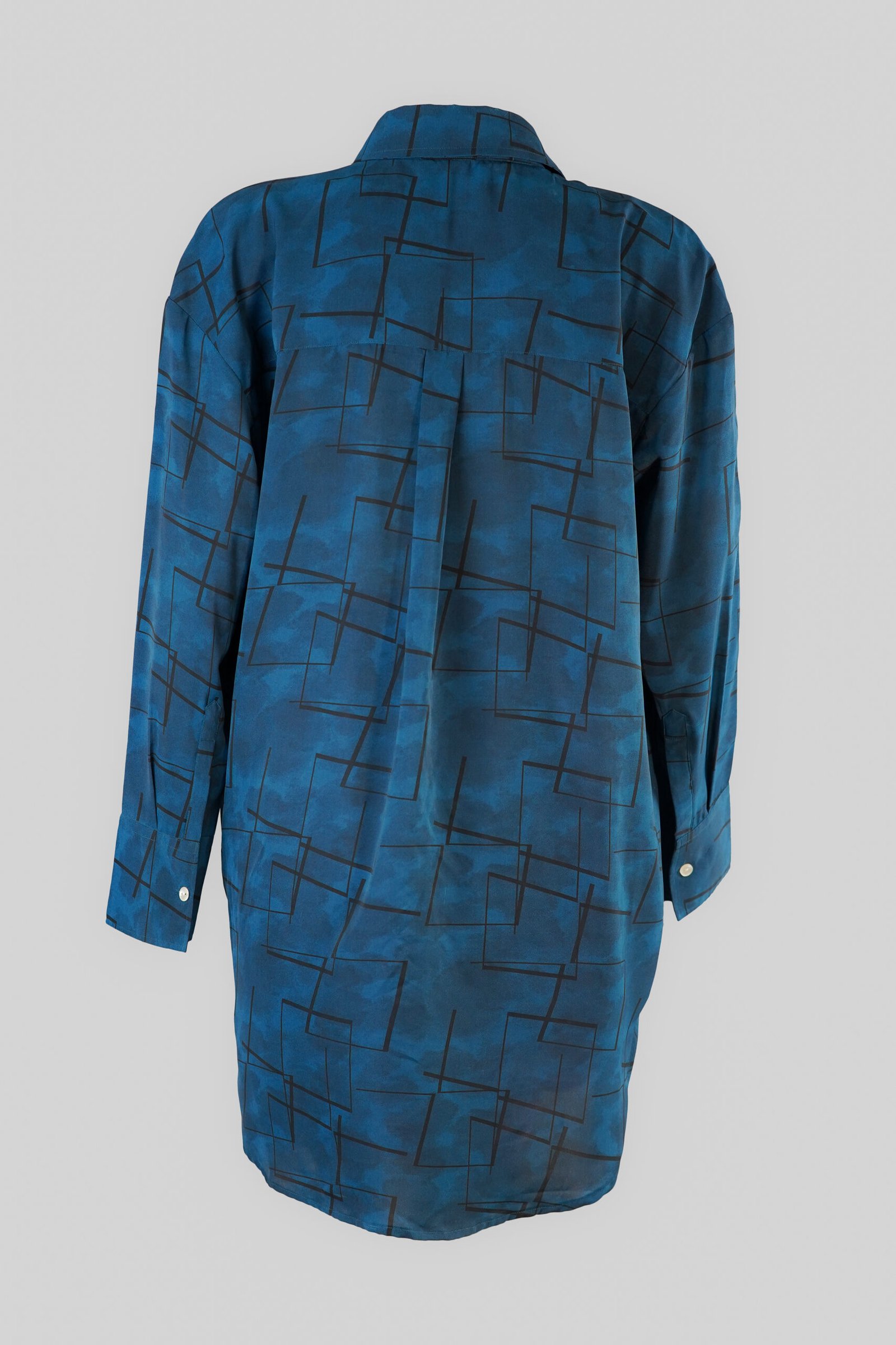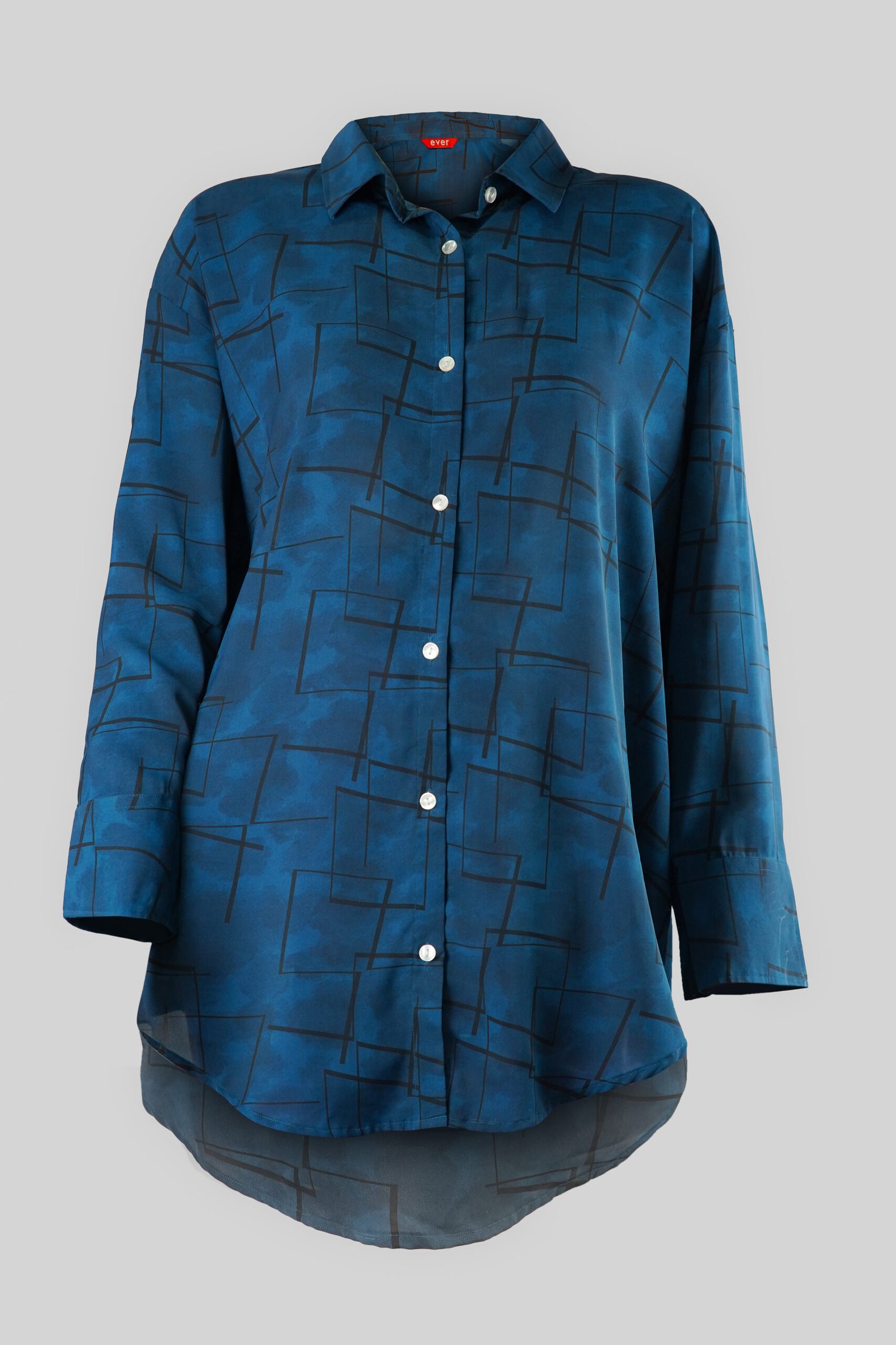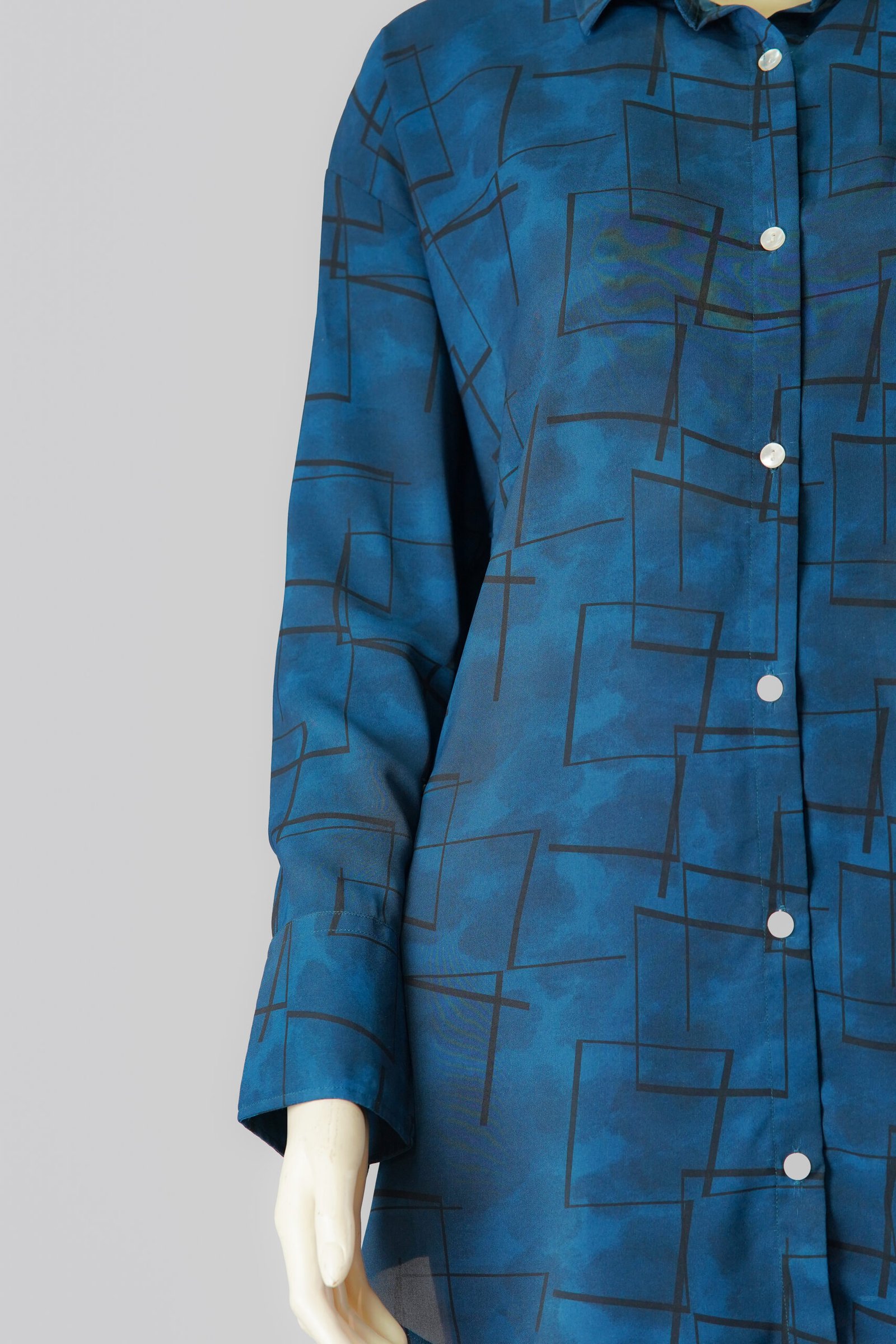 The deep ocean blue base is beautifully enhanced with a contemporary geometric print, bringing a refined yet stylish edge to your everyday wardrobe. Designed with a collared neckline, button-down front, and long sleeves, this shirt offers versatility — ideal for both casual wear and office chic.