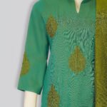 Paired with tailored straight pants and a semi-moslin orna in rich olive tones, this ensemble captures a graceful balance of tradition and sophistication. Lightweight, breathable, and effortlessly stylish — it’s designed for women who embrace elegance in every detail.