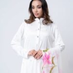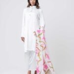 A graceful white kurta intricate hand work paired with matching pants and a soft floral-hand painted dupatta. Designed in a clean, elegant silhouette with delicate detailing, this set offers lightweight comfort and timeless charm—perfect for daytime events, festive gatherings, or refined everyday wear.