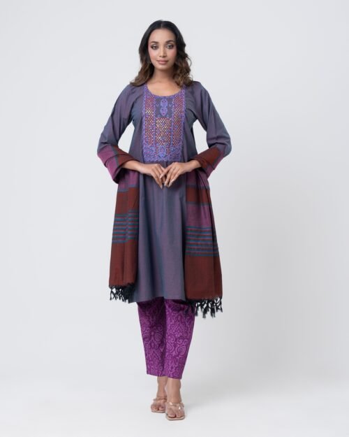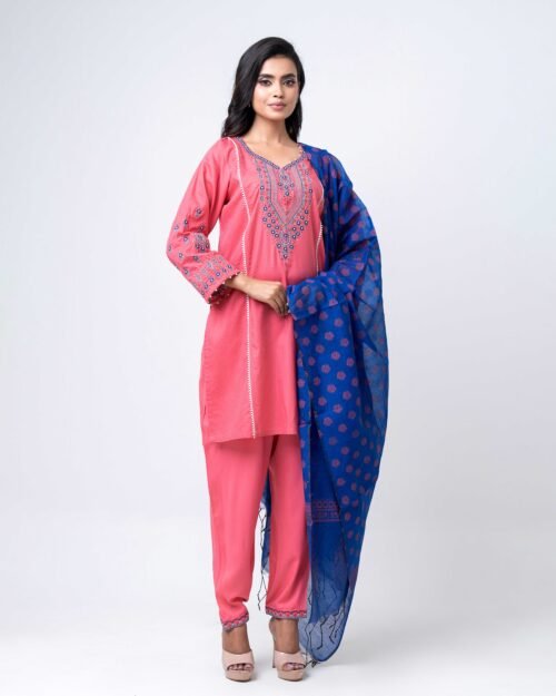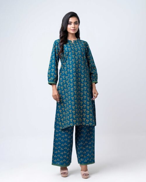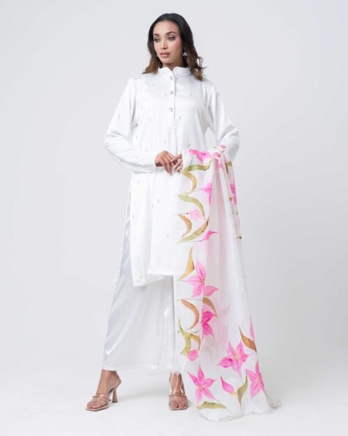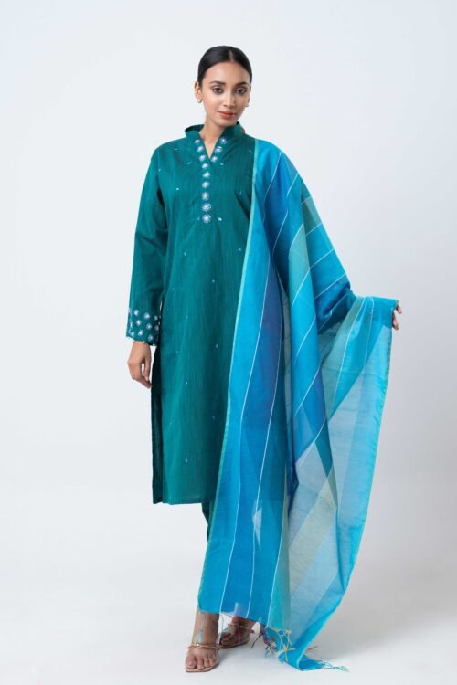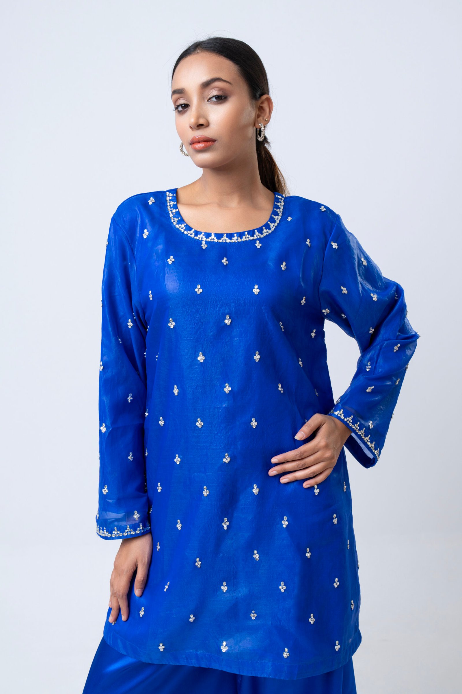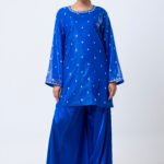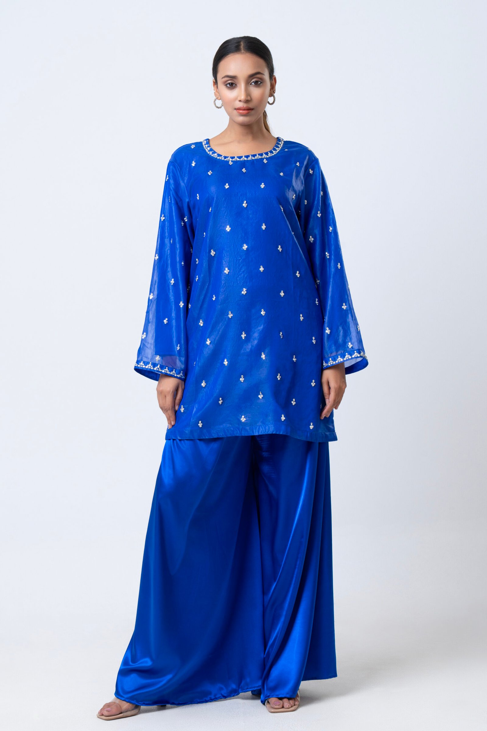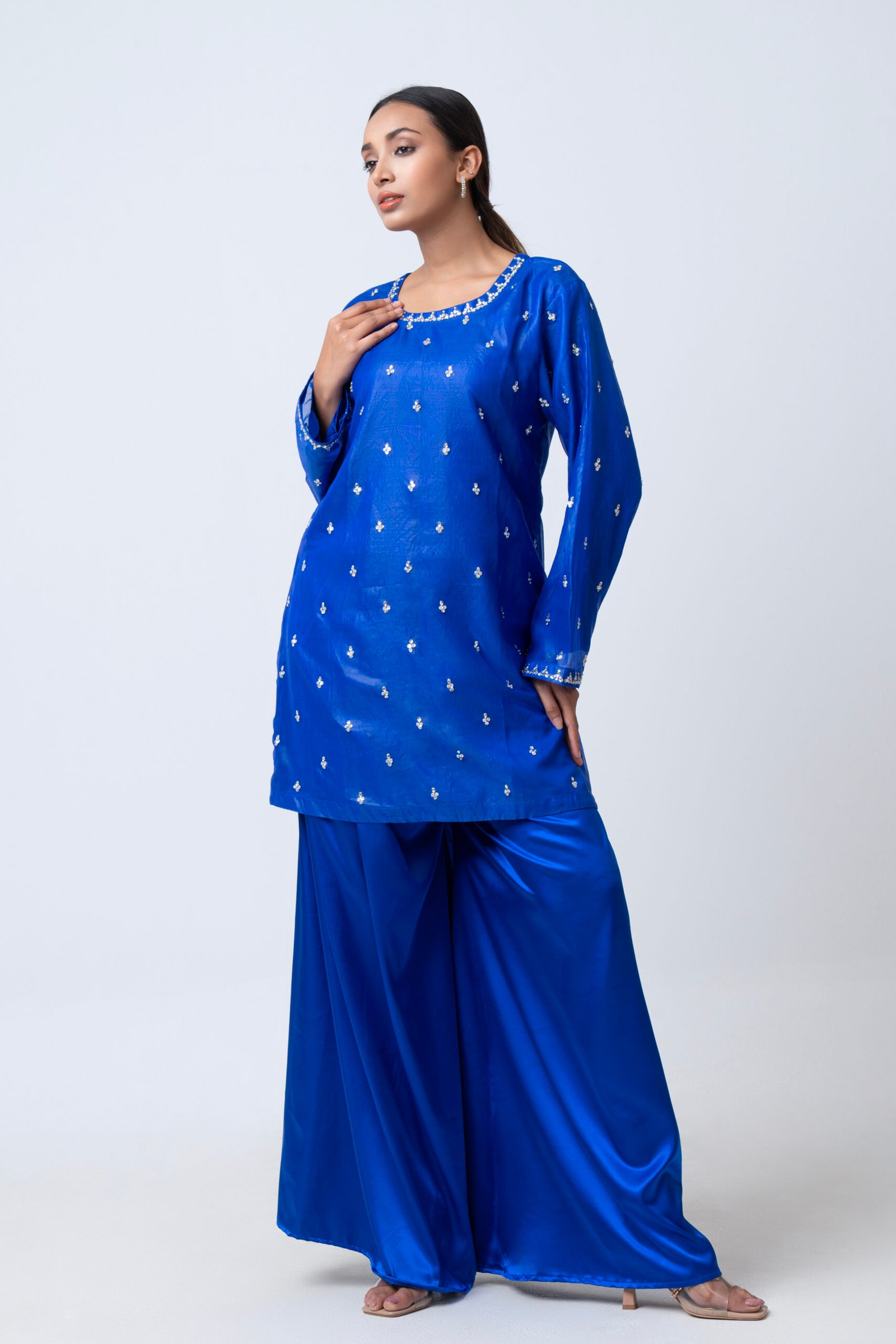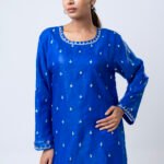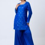 A striking royal blue ensemble featuring a delicately embellished kurta with subtle handwork detailing across the neckline, sleeves, and body. Paired with flowy wide-leg pants, this elegant set offers a graceful silhouette with a modern touch. Perfect for festive occasions, evening gatherings, or statement semi-formal wear, it combines rich color with refined sophistication