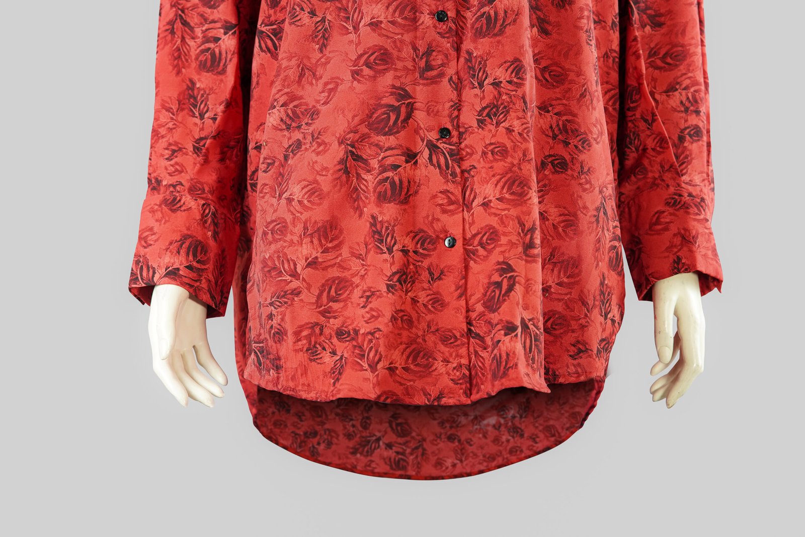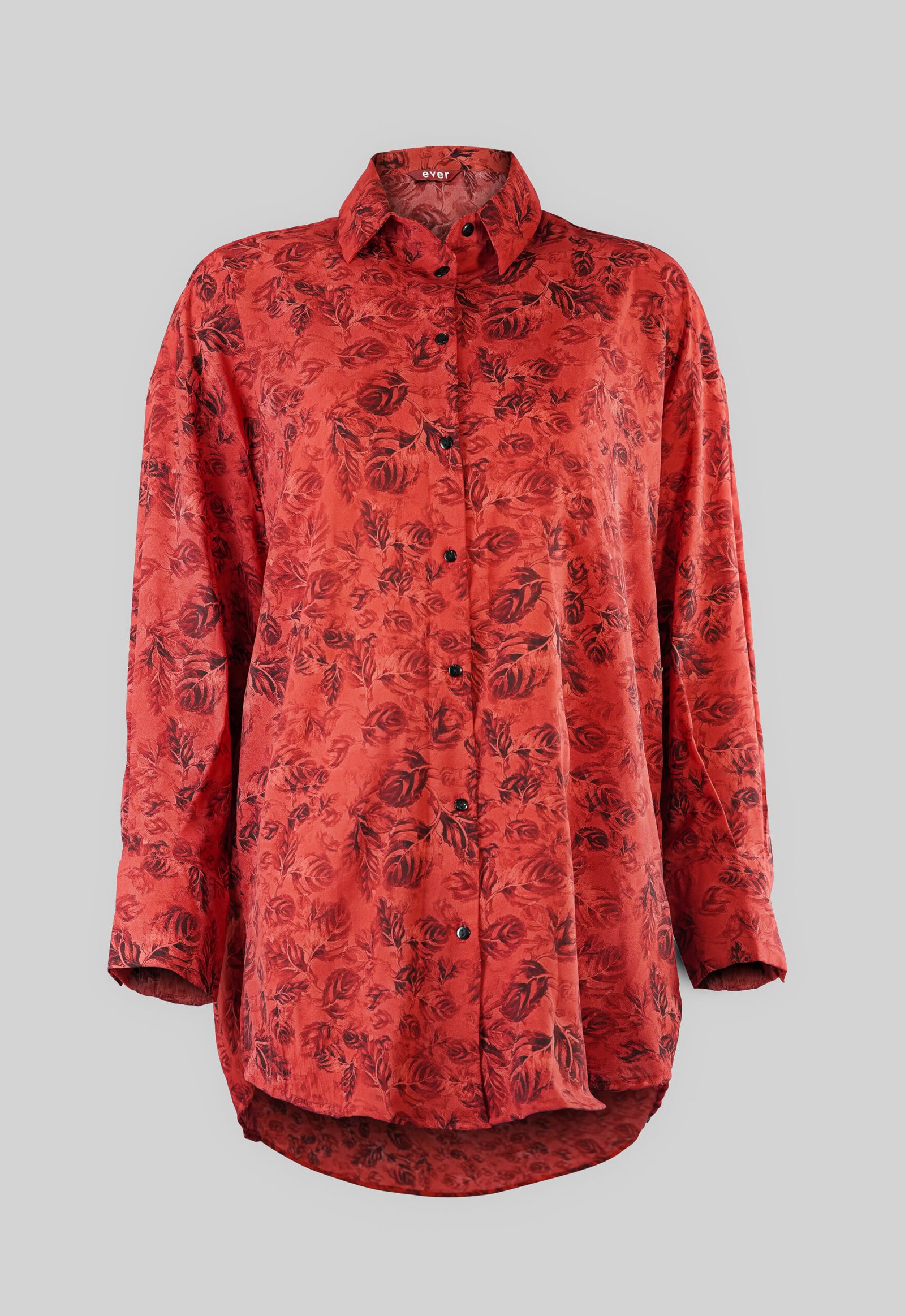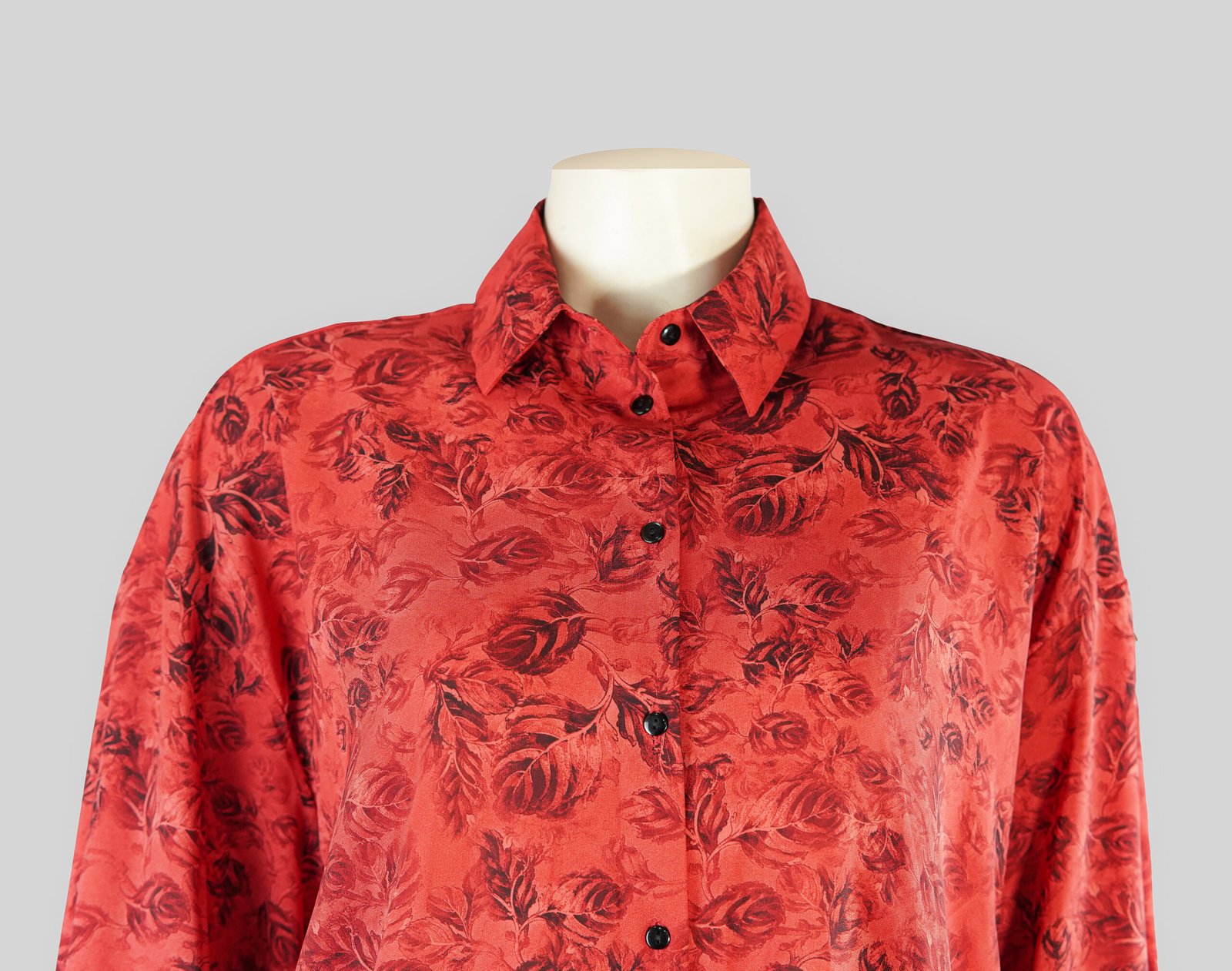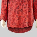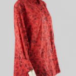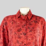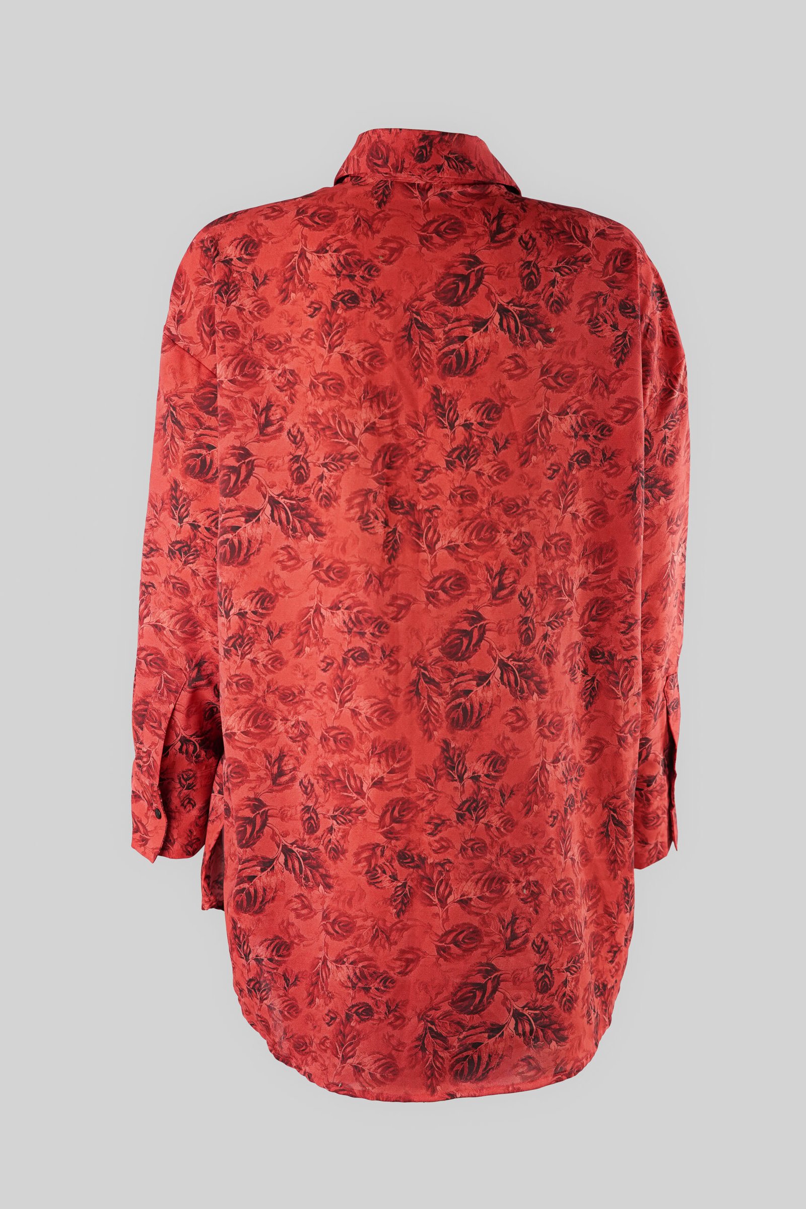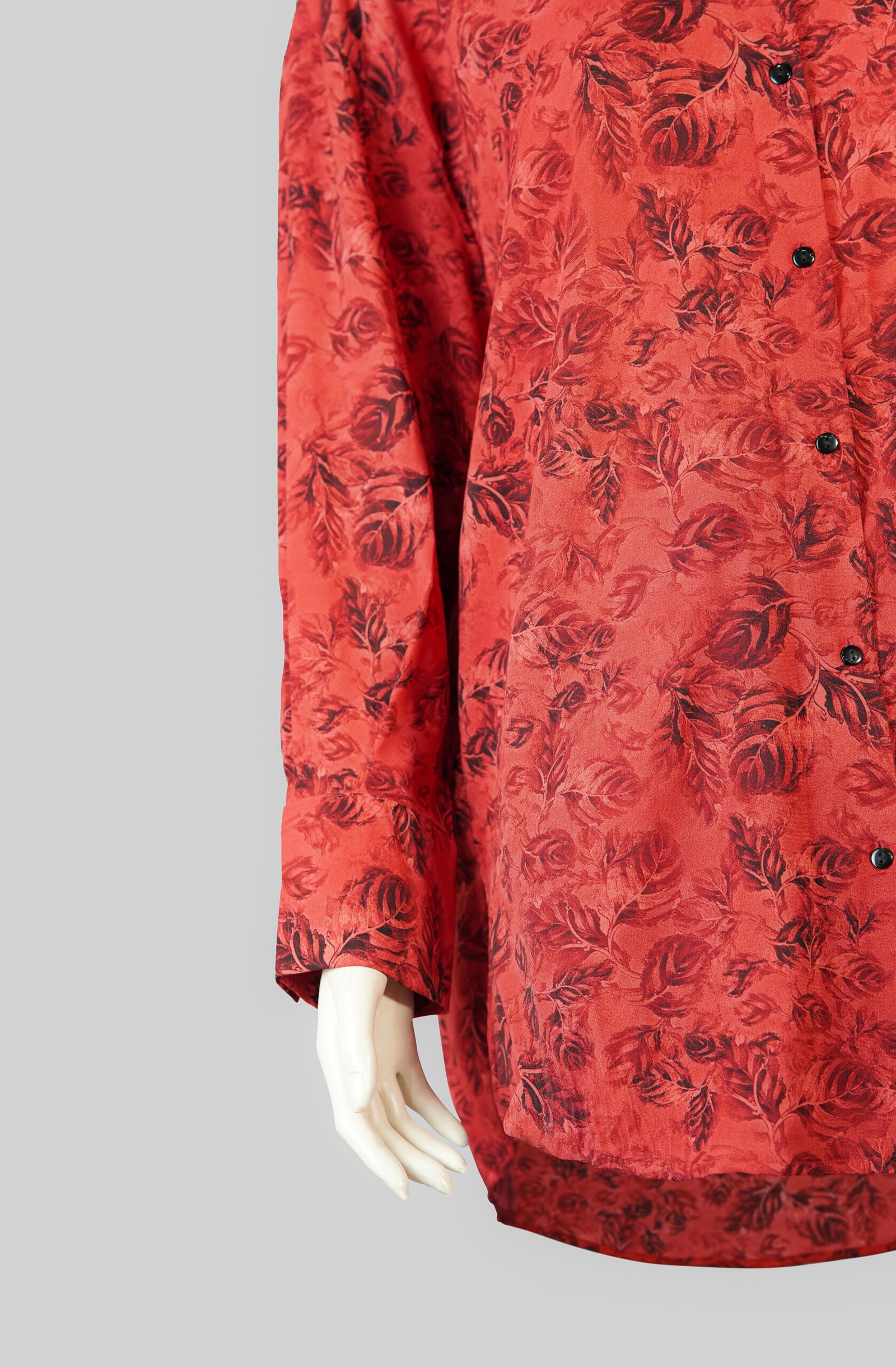 The rich scarlet base is adorned with delicate floral patterns, creating a graceful contrast of texture and depth. Designed with a classic collared neckline, full button-down front, and long sleeves, this shirt is the perfect blend of contemporary charm and timeless appeal.