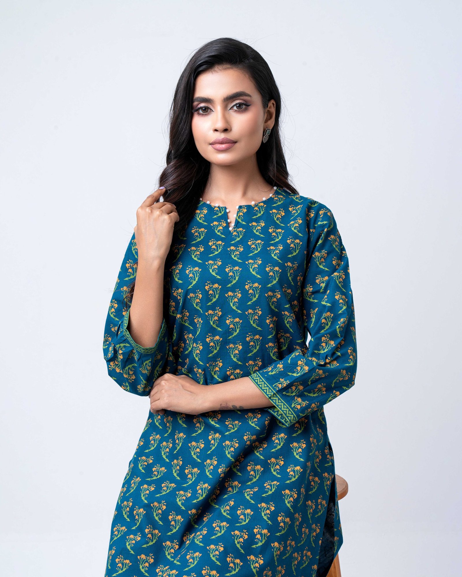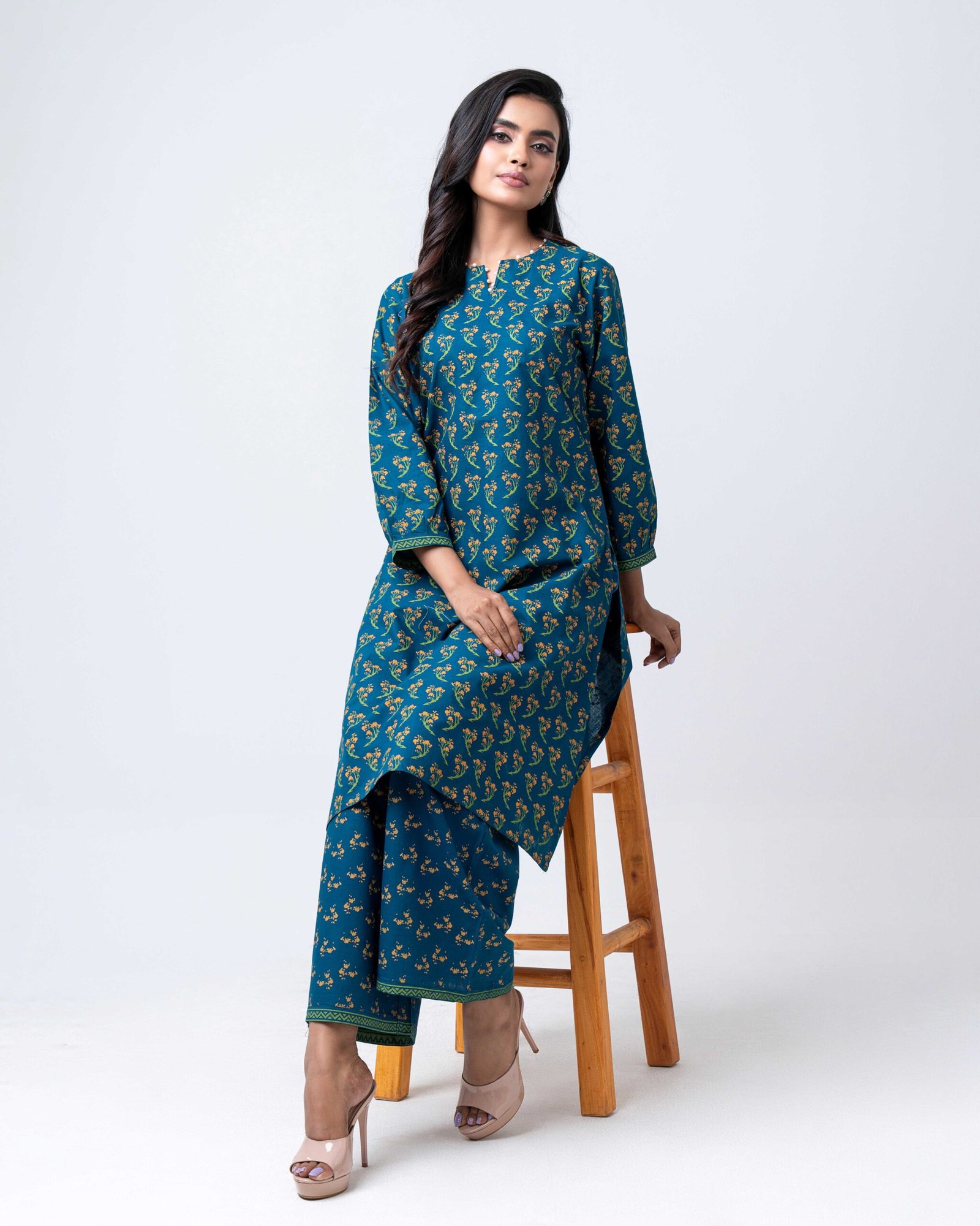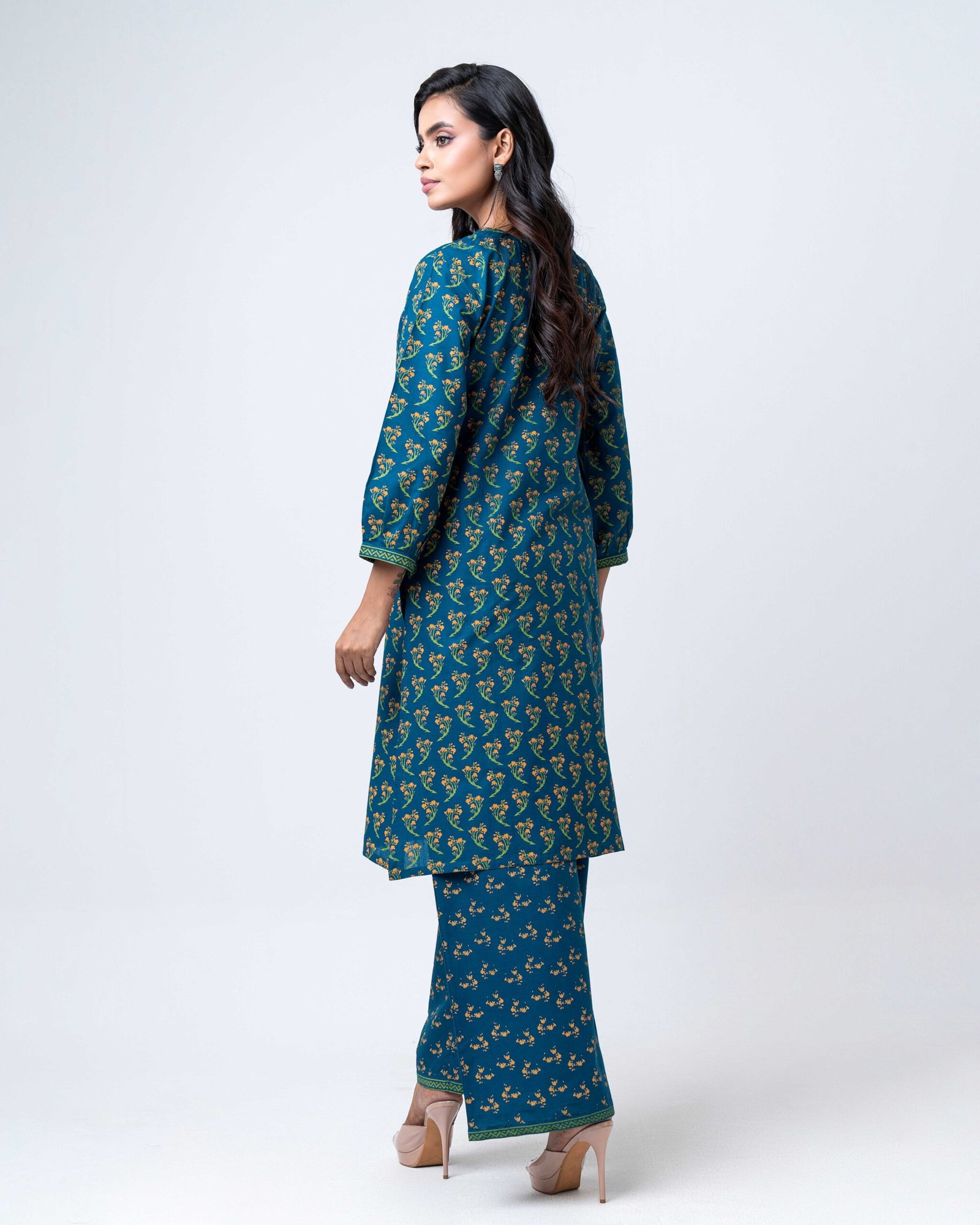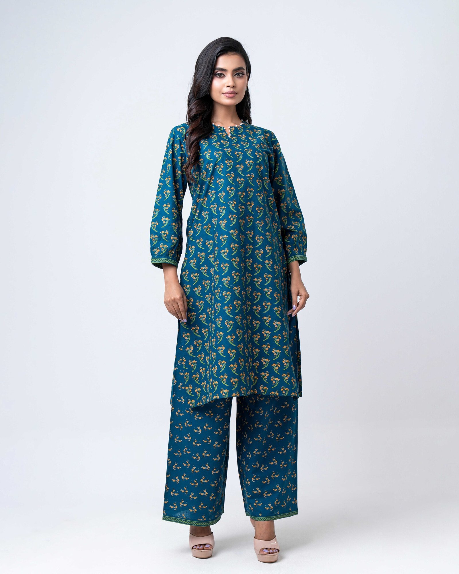 This elegant teal kurta set features a graceful all-over floral print that adds a refined, timeless charm. Designed with a comfortable straight-cut kurta and matching printed pants, it offers a relaxed fit with a polished look—perfect for office wear, casual outings, or day-long comfort with effortless style.